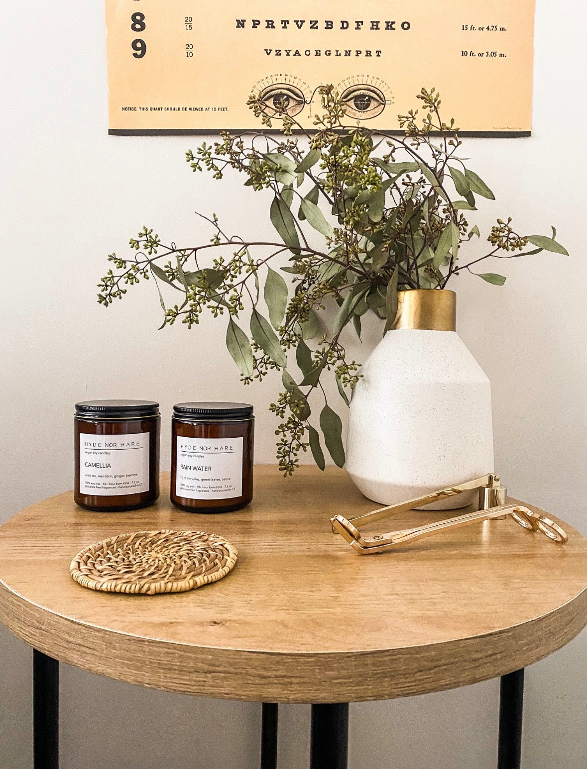 -Each candle is hand poured in small batches in Connecticut and is always vegan. They contain %100 soy wax, raw wicks made of just cotton and paper and phthalate-free fragrance oils. Every candle is also free of animal ingredients, toxins, paraffin, parabens, dyes and additives.